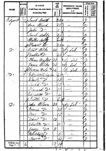 In 1841, just after Queen Victoria came to the throne, the first more detailed census was taken. Details were recorded of everyone's occupancy, their name, age (to within 5 years), their occupation, and whether or not they were born in the county where they now resided.